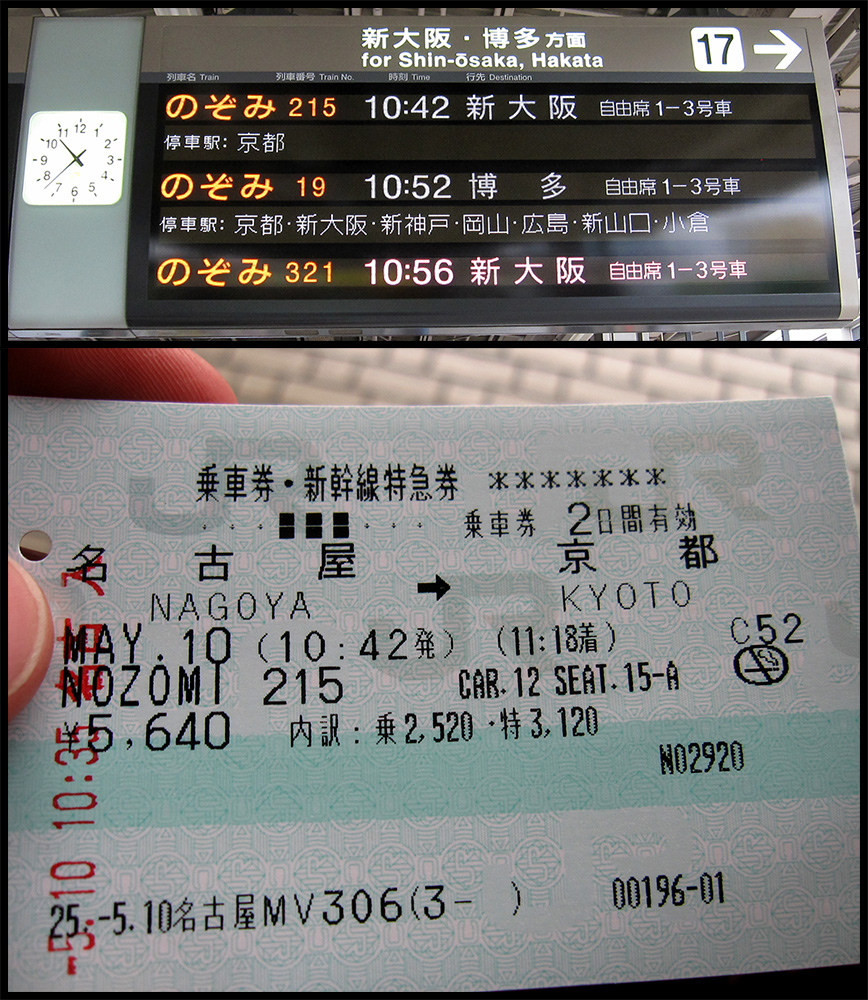 Väl på stationen i Nagoya var det dags att leta efter shinkansen (snabbtåg) mot Kyoto. Nämnde jag att Nagoya Station är världens största tågstation? Tja, det hjälpte inte direkt kan jag säga. Inte att jag hade varit där tidigare heller, för shinkansen åkte jag aldrig med då. Det låter jobbigare än det var, för jag hittade ändå relativt snabbt vart jag skulle. Köpte biljetten ganska tidigt och tänkte att “åh, vad bra att jag kan köpa biljetten här, då kan det ju inte vara långt till plattformen”. Hade väl en kvart på mig, så det var gott om tid tyckte jag. Men med stora tunga väskor och förvirrande skyltning tog det ändå runt 10 minuter att ta mig till plattformen från biljettautomaten. Kunde lätt tagit en kvart också, så jag var lite stressad en stund där. Som vanligt i Japan kom tåget exakt i tid och anlände i Kyoto när det skulle. Det var inte jättemycket folk i min vagn, men åkte inte heller på den allra flitigaste timmen och tåget var enormt långt! Lyckades mot alla odds (trötta armar från trappbärandet) få upp väskorna på hyllan ovanför sätet och kunde falla ihop i en hög på min plats. Det satt ingen bredvid mig, så jag kunde andas ut lite extra. Ville inte sova i rädsla att missa min hållplats sen. Knappt 15 mil tog 36 minuter, så det gick ganska fort ändå!