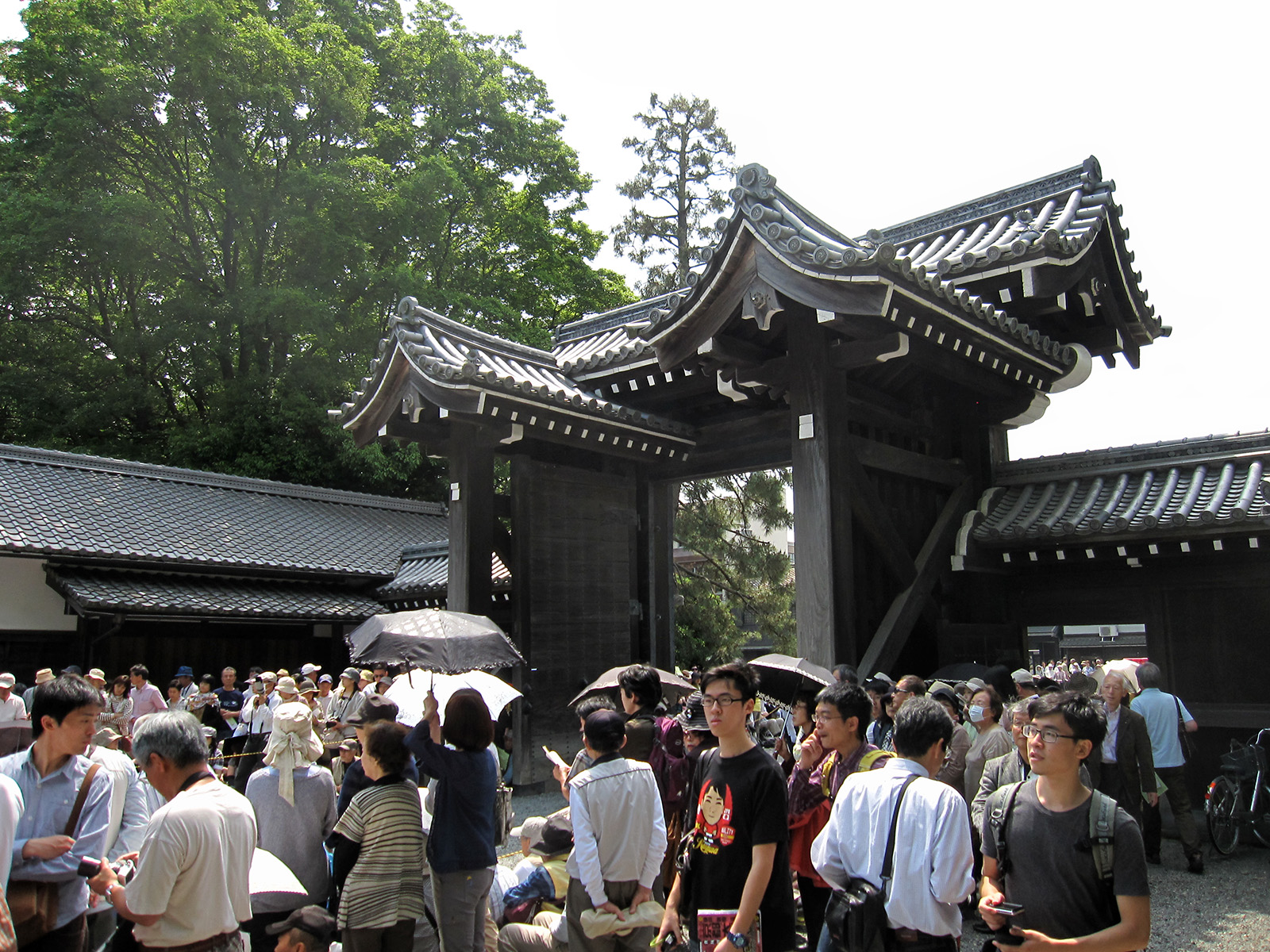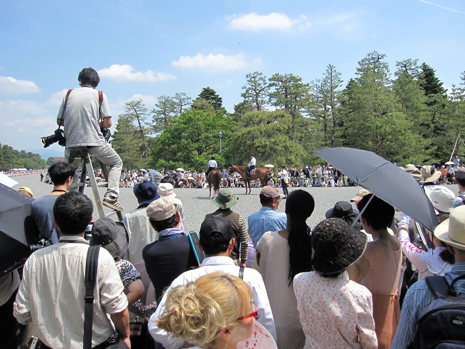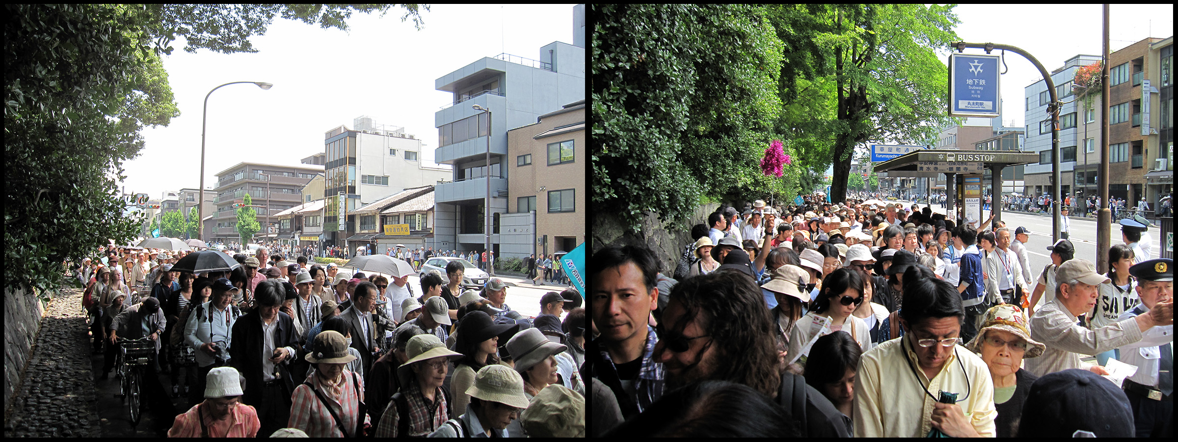 Kan säga att det märktes ganska tidigt att det var något på gång idag. Tog tunnelbanan mot Kyotos kejsarpalats, där själva paraden börjar. Visst, när jag gick på var det inte så mycket folk, men nästa hållplats var centralstationen. Tyckte det blev ganska lagom packat då, men ändrade mig snart. Näst sista stationen innan jag skulle av var där Kyotos enda två linjer korsar varandra… Tror inte jag behöver säger mer än så! Det var kö från plattformen man går av tåget vid hela vägen till palatset. Yay!