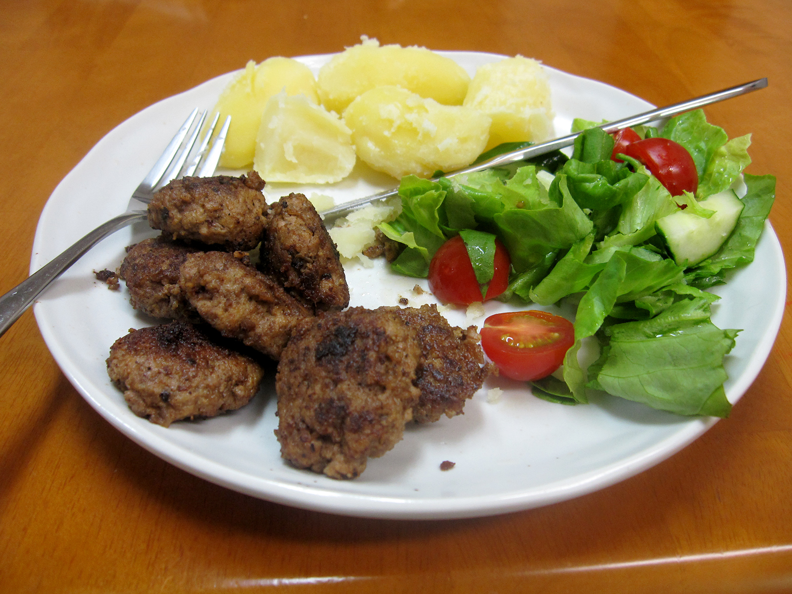Såhär blev resultatet. Inga supersnygga köttbullar kanske, men dugliga ändå. Kan inte direkt säga att jag är någon mästerkock, men smakade bra gjorde dom allt. Hittade alla ingredienser på ett vanligt supermarket :) Allt utom lingonsylt, förstås :( Fast det är ändå godast till köttbullar och potatismos, vilket jag inte orkade göra idag. Tänkte också att det var mer midsomrigt att ha vanlig kokt potatis.